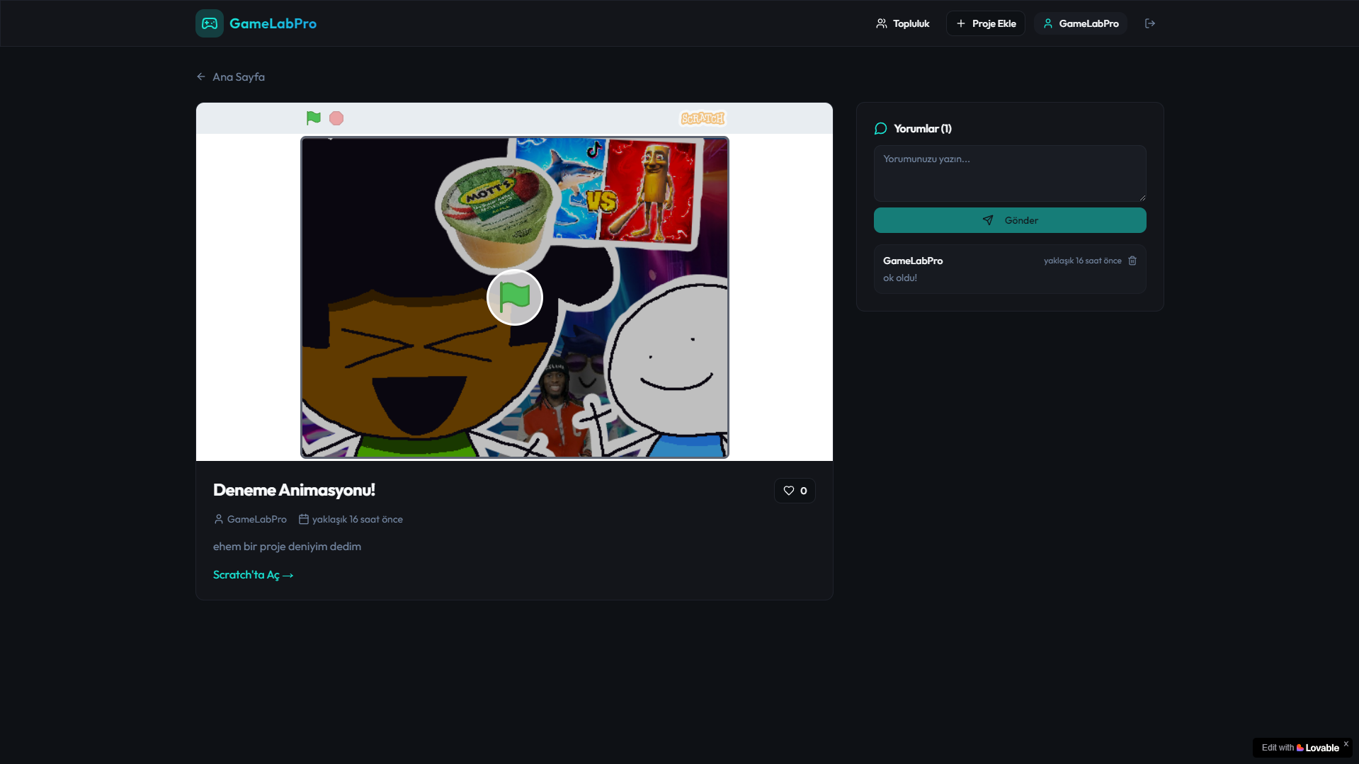 GameLabPro, Scratch ile proje geliştirmeyi seven herkes için tasarlanmış eğlenceli, yaratıcı ve tamamen topluluk odaklı bir platform!